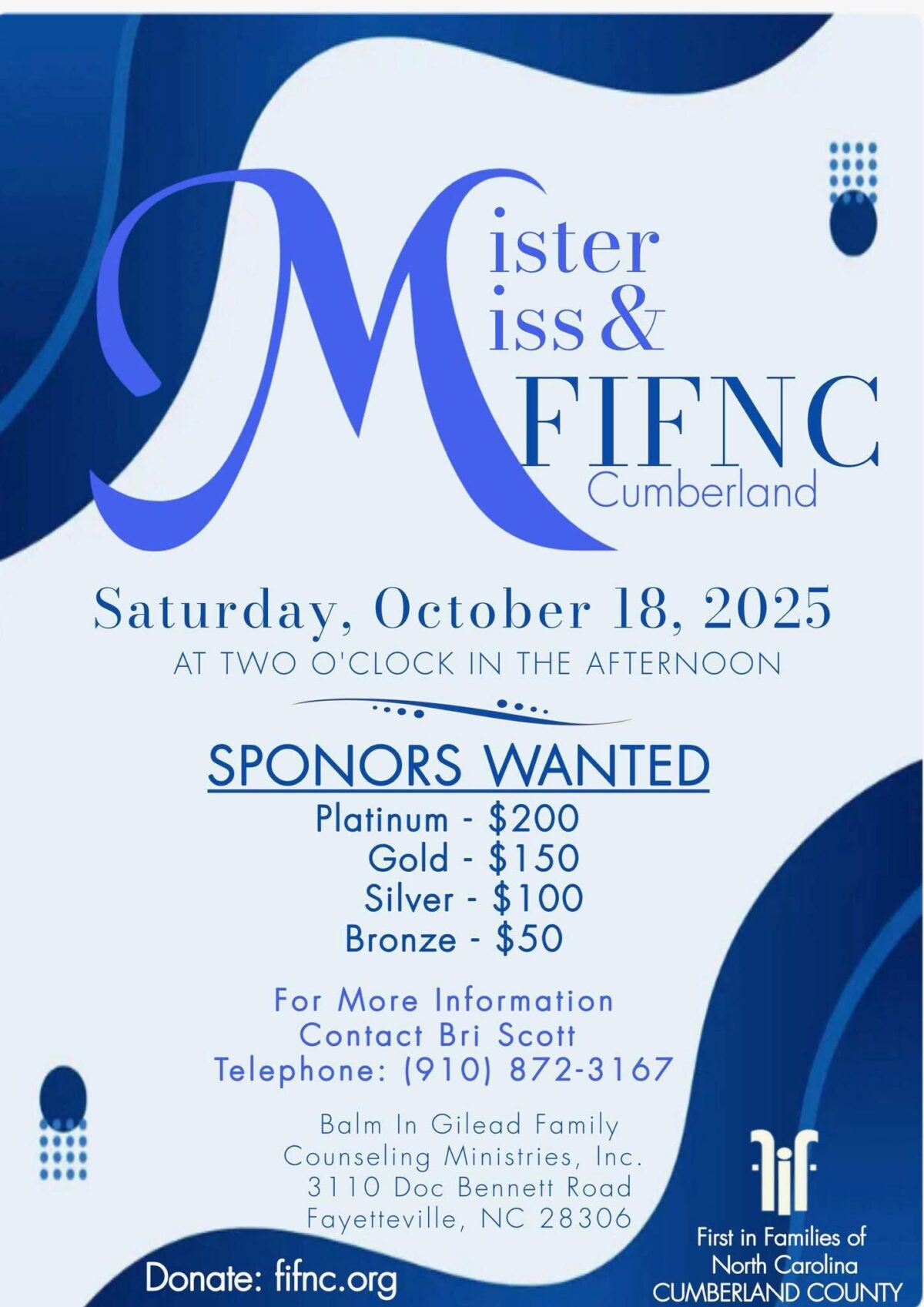 Fayetteville, NC – September 16, 2025 – First in Families of North Carolina (FIFNC) Cumberland County will host the 2nd Annual Mister & Miss FIFNC Pageant on Saturday, October 18, 2025, at 2:00 p.m. The event will take place at Balm In Gilead Family Counseling Ministries, 3110 Doc Bennett Road, Fayetteville, NC 28306, and aims to celebrate the talents, confidence, and achievements of individuals living with disabilities.