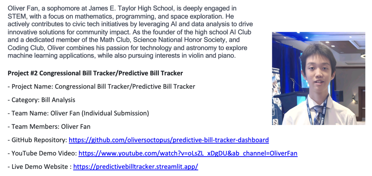 “Oliver’s Congressional Bill Tracker is a beacon of innovation from the next generation of civic tech leaders,” said William Theos, founder of Legalese Decoder. “By hosting it on our platform, we’re not just amplifying his work—we’re creating a seamless hub where users can decode complex bills with Legalese Decoder’s plain-English translations and then dive into predictive analytics with Fan’s tracker. This synergy makes legislative tracking more accessible than ever, turning opaque lawmaking into an empowering tool for everyday Americans.”