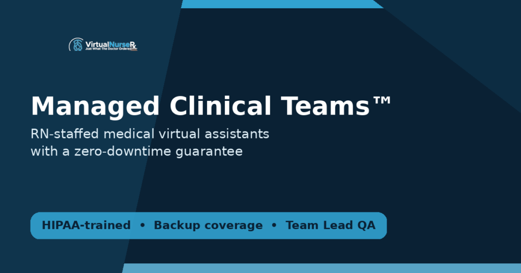 Virtual Nurse Rx provides RN-staffed medical virtual assistant services for healthcare practices seeking scalable clinical operations support with structured redundancy, quality oversight, and continuity protection.